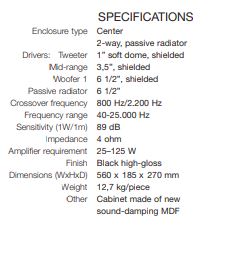 A center speaker well suited for the larger home theater. New double chamber tweeter mounted in aluminium die-cast face plate for improved linearity and lower distortion. New 6,5” woofer with shortening ring design for improved power handling, lower distortion, and improved phase linearity.