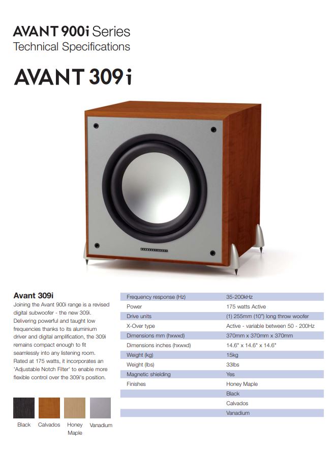 Joining the Avant 900i range is a revised digital subwoofer – the new 309i. Delivering powerful and taught low frequencies thanks to its aluminium driver and digital amplification, the 309i