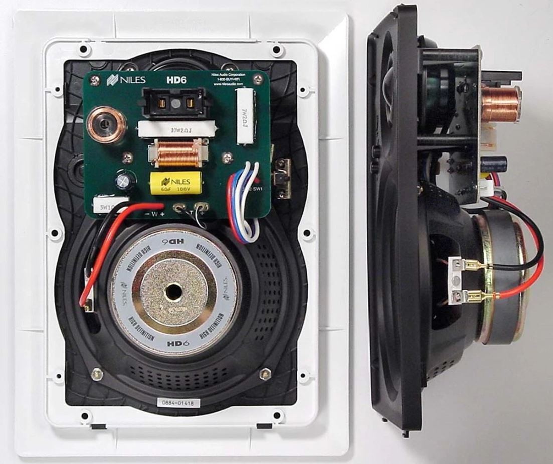 Niles HD6R In-Wall High Definition Loudspeakers uncover subtle nuances in recorded music or the thunderous action in a movie. The 6.5-Inch woofer driver features cone material that combines injection moulded polypropylene with talc, carbon and ceramic resulting in an extremely stiff cone for dynamic response.